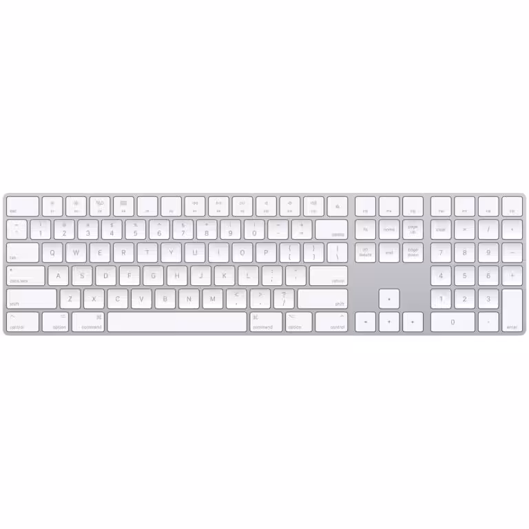 Magic Keyboard with Numeric Keypad features an extended layout, with document navigation controls for quick scrolling and full-size arrow keys for gaming. A scissor mechanism beneath each key allows for increased stability, while optimized key travel and a low profile provide a comfortable and precise typing experience. The numeric keypad is also great for spreadsheets and finance applications. And the built-in, rechargeable battery is incredibly long-lasting, powering your keyboard for about a month or more between charges.