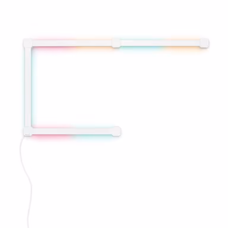 Nanoleaf Lines 90 Degrees Smarter Kit (4 LED Light Lines) are smart backlit LED light bars that deliver stunning RGB illumination in a never-before-seen modular form factor. Ultra-lightweight light lines connect together to create intricate geometric designs on your wall. Two color zones per bar allow for complete customization of over 16M colors and dynamic lighting animations that flow across your entire layout. Features like Rhythm music visualization and Screen Mirror sync with your media to transform your space with immersive shows of color and light. Installation is simple with the included double-sided mounting adhesive tape, and requires no additional tools or drilling. Control easily with physical buttons, voice commands, or the intuitive Nanoleaf App for an elevated smart home experience. Perfect for creating an ultramodern look in the living room, desk area, battlestation, or bedroom as both ambience and art.