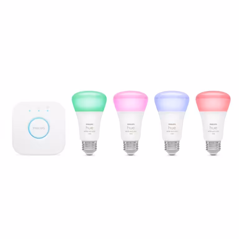 Philips Hue White and Color Ambiance A19 Bluetooth 75W Smart LED Starter Kit Get bright cool light, warm white light, and 16 million colors with the Philips Hue 75W A19 Starter Kit. The four Philips Hue 75W A19s provide a sufficient level of white light that’s bright enough to read on the couch, listen to music, or simply relax in your bedroom. Use bright, colorful light to enhance your décor or to match your mood. Set the mood from anywhere with the full suite of smart lighting features with the included Hue Bridge.