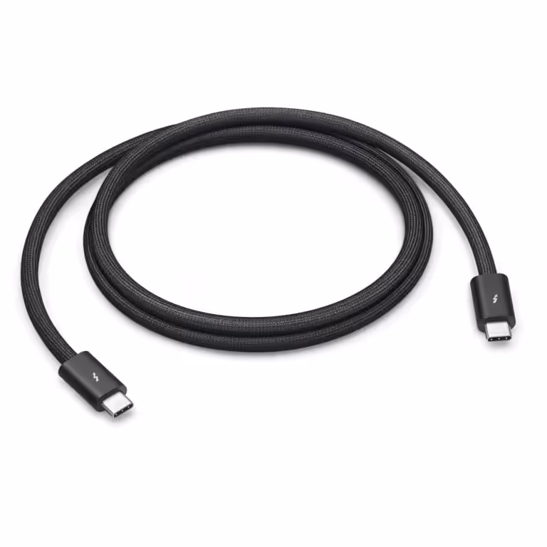 Thunderbolt 4 Pro Cable (1 m) featuring a black braided design that coils without tangling, this 1-meter cable supports Thunderbolt 3, Thunderbolt 4, and USB 4 data transfer up to 40Gb/s, USB 3.1 Gen 2 data transfer up to 10Gb/s, DisplayPort video output (HBR3), and charging up to 100W. Use this cable to connect a Mac with Thunderbolt 3 or 4 (USB-C) ports to Thunderbolt (USB-C) and USB displays and devices such as Studio Display, Pro Display XDR, docks, and hard drives.