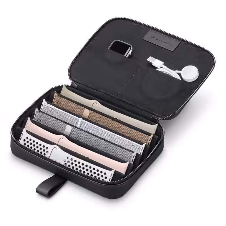 von Holzhausen The Watch Band Portfolio neatly displays, organizes, and transports your Apple watch bands and accessories. The Portfolio has two multipurpose interior pockets for accessories and one large exterior pocket for storing small items. It’s made with von Holzhausen’s Technik-Leather, a 100% animal free and sustainable performance fabric that’s durable and easy to clean. Inside it’s lined with soft microfiber made from recycled plastic water bottles.
